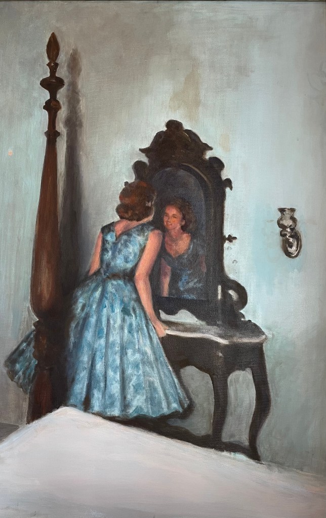 She grew up in Mobile, Alabama, in a large, old, white house on Government Street that she and her brother and sister shared with their parents and paternal grandparents. She loved her life in that house and treasured those memories, the connections with her beloved grandmother, Aunt Anne, and cousin Mary and countless other relatives. She adored her younger brother and sister, although she always told me it was quite a shock when they came along to realize she was no longer the center of attention in that house. She loved to tell us stories of her childhood, how safe she felt, how loved, being in the center of all that warmth and activity. It was why she wanted a house full of children. Just as an aside, the two portraits of her up here were painted by her mother, a wonderful artist.