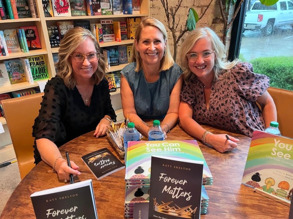 Forever Matters book launch party at Little Professor Bookstore Pepper Place in Birmingham, AL with my author-sister Emily Carpenter and author-friend Anna Nash. July 2024.